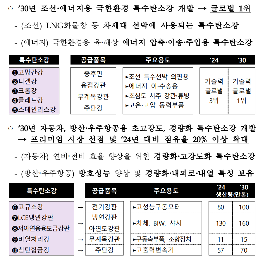 조선·에너지·자동차·방산·우주항공 등 분야에 활용되는 특수탄소강 등 미래 유망 품목에 대해서는 세계 최고 수준의 기술력과 생산 기반을 확보할 수 있도록 글로벌 시장 선점을 위한 투자를 강화한다. 이를 위해 10개 특수탄소강 R&D를 위한 2,000억원 규모의 지원에 나선다. 현재 12% 수준인 특수강 비중을 2030년까지 20%로 높여 일본(17%)을 넘어서고 독일(38%)과 경쟁하는 수준이 되도록 지원한다.