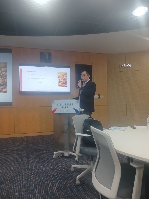 4일 서울시 강남구 포스코센터에서 열린 ‘스틸코리아 2025 글로벌 전환기 철강산업의 대응방안’에서 홍덕화 ITC 이사가 발표하고 있다.