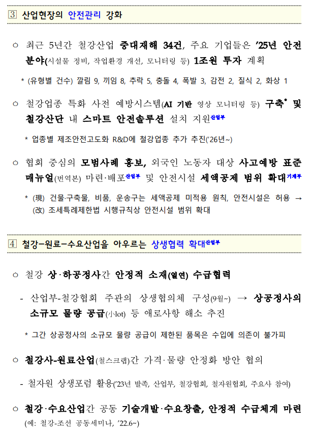 철강업계와 노동계의 공통 관심 사안인 ‘산업현장의 안전관리 강화’ 부문에선 주요 철강 기업들이 올해(2025년) 안전 부문에만해도 1조 원가량을 투자 계획 및 집행하고 있으나 중대재해가 아직 발생하고 있는 점을 감안한 대책을 시행키로 했다. 산업부가 나서 철강업종 특화된 사전 예방시스템(AI 기반 영상 모니터링 등) 구축하고 철강산단 내 스마트 안전솔루션 설치 지원할 예정이다.