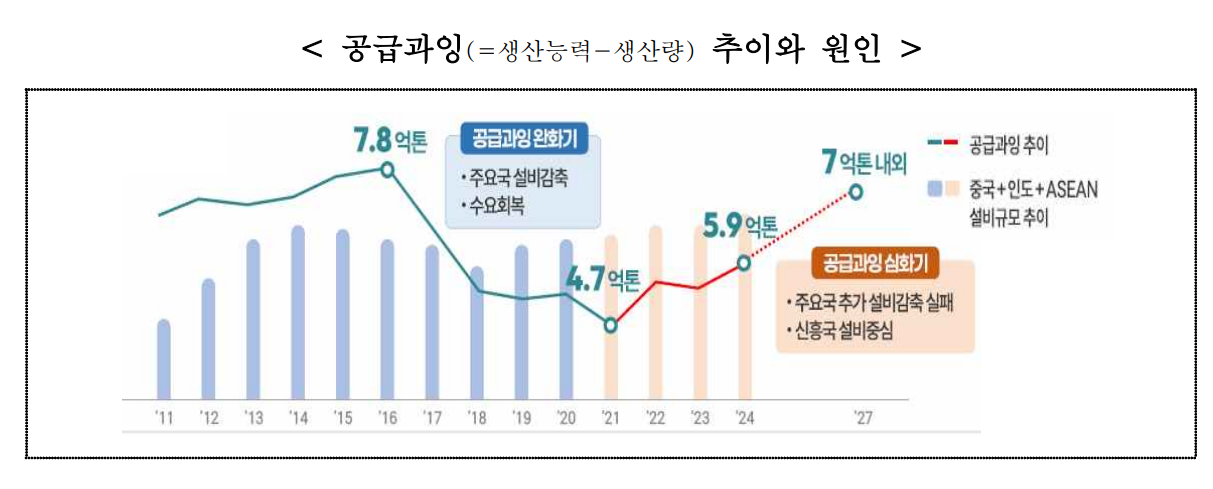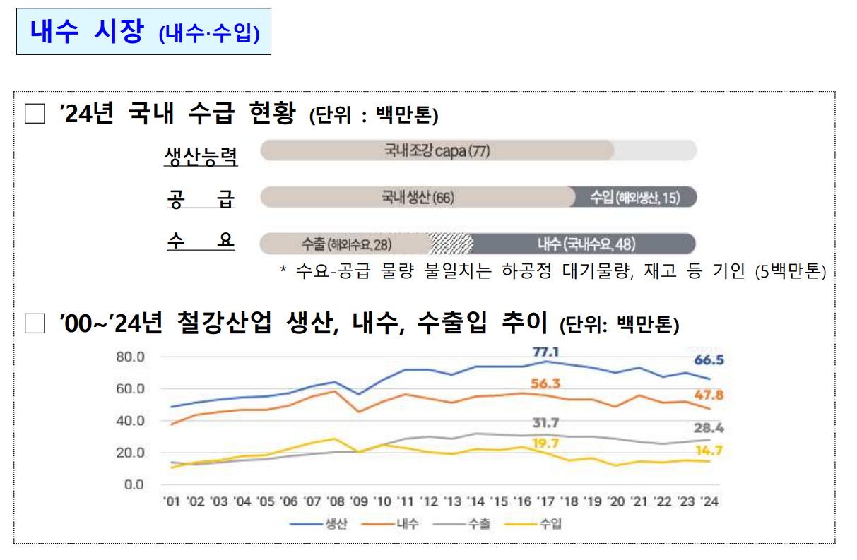 세계적으로도 철강 공급과잉 물량이 2021년 4.7억 톤에서 2024년 5.9억 톤으로 증가하면서 국내 철강업은 수출 난조(2025년 3분기 수출액 전년比 24% 급감)와 수입 증가(수입재 점유율 2021년 26%→2024년 31%), 내수 시장 침체(15년째 이어진 내수 5천만 톤대가 2024년부터 붕괴) 등의 삼중고를 겪고 있다.