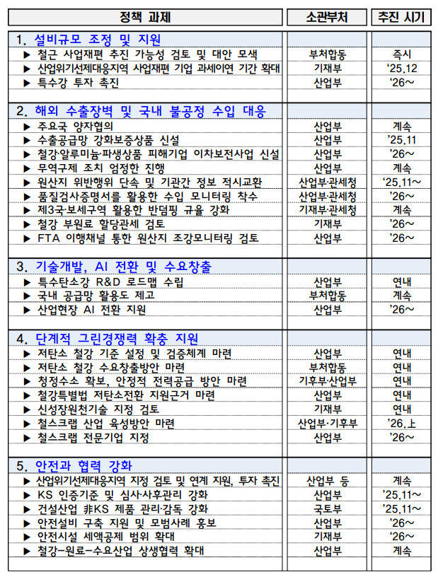 또한 정부는 타국에서는 철강업이 내수 산업에 가깝지만 우리나라에서는 6대 주력 수출 품목(2024년 333억 달러 수출)으로 꼽히는 등의 중요성으로 안정적 생산기반을 유지시키기 위해 위기에 놓인 철강업에 대한 지원이 필요하다고 지적했다.
