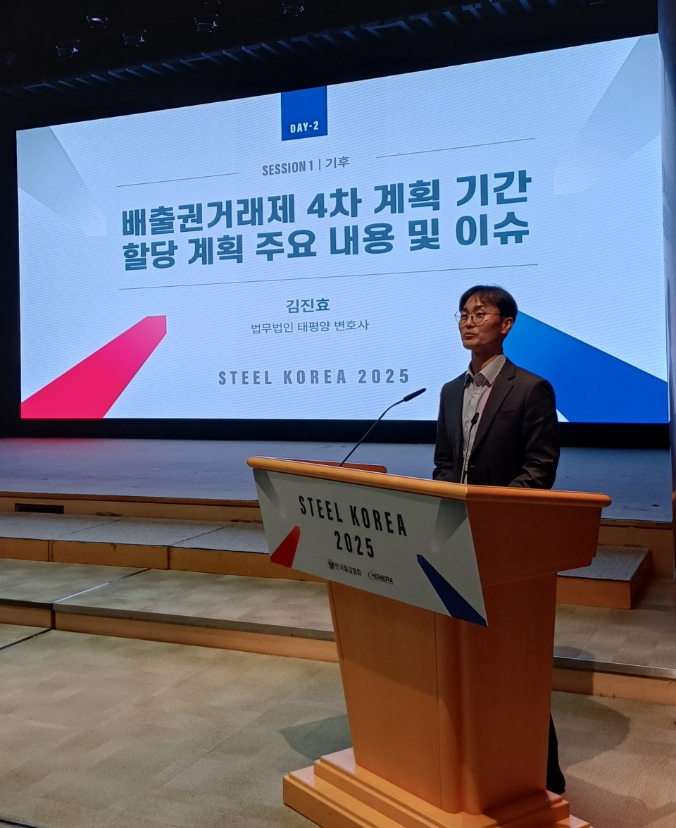 김진효 법무법인 태평양 변호사는 한국철강협회와 한국금속재료연구조합이 5일 개최한 '스틸코리아 2025'에서 '배출권거래제 4차 계획기간 할당계획 주요 내용 및 이슈'를 발표했다.