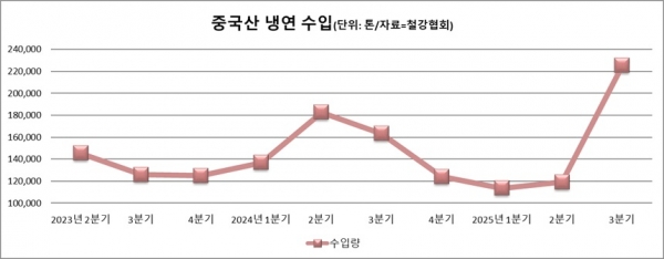 철강협회 통계자료에 따르면 2025년 3분기 중국산 냉연강판(풀하드 포함) 수입량은 22만5천톤으로, 전년 동기 16만3천톤 대비 37.8% 증가했다. 특히 2025년 8~10월 월평균 수입량은 약 7만5천톤으로, 2024년 평균 수입량 약 5만 톤대를 40% 이상 웃돌았다.