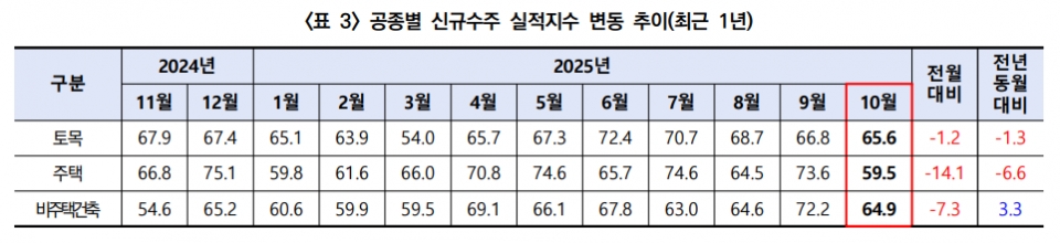 공종별 신규수주의 경우 10월 토목(65.6)이 전월 대비 1.2p 떨어진 가운데 특히 주택(59.5)과 비주택건축(64.9)은 각각 14.1p, 7.3p 급락했다. 주택지수는 최근 17개월 만에 최저 수준이다.