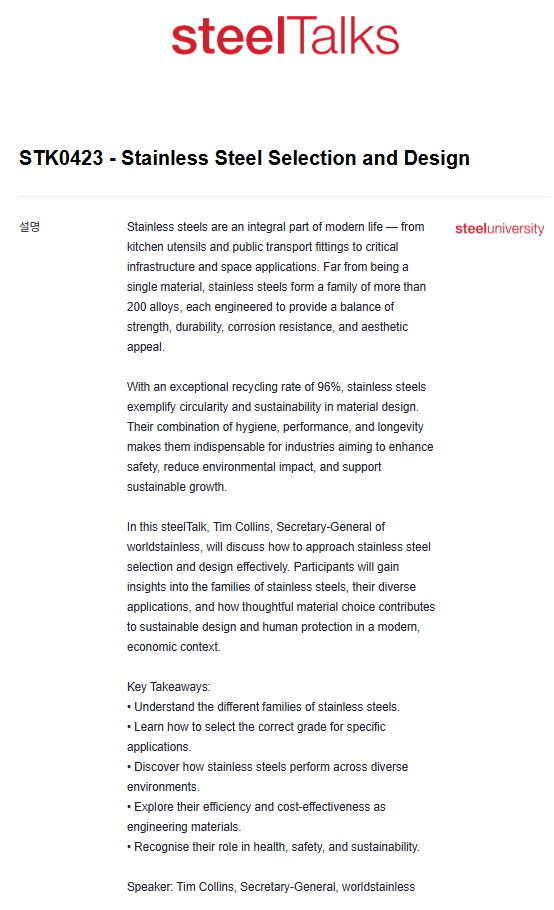 이번 웨비나는 ‘스테인리스스틸 선택 및 설계(Stainless Steel Selection and Design)’를 주제로  세계스테인리스협회 팀 콜린스 사무총장이 발표를 맡을 예정이다.