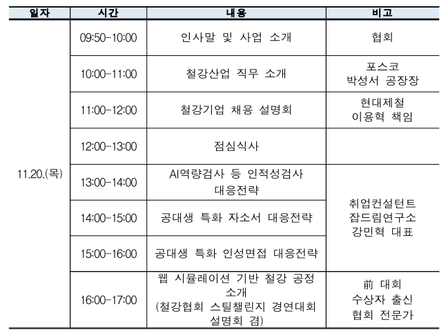 먼저 10시 오전 세션에서는 박성서 포스코 공장장이 철강산업의 주요 직무와 현장 역할, 필요 역량을 소개하고, 이어 현대제철 이용혁 책임이 채용 트렌드와 평가 포인트를 설명한다.