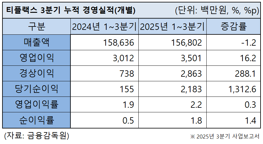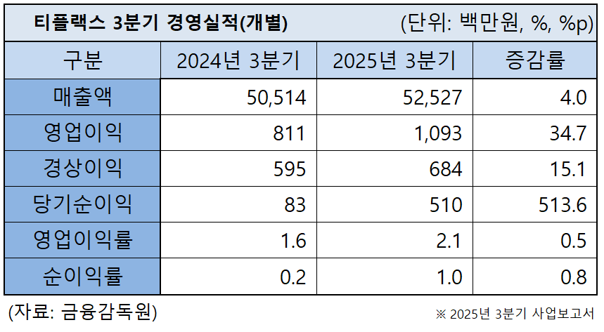 금융감독원에 따르면 티플랙스의 3분기 매출액은 525억 원으로 전년 동기 대비 4% 증가했다. 수익성도 개선되어 분기 영업이익이 10.9억 원으로 전년 동기 대비 34.7% 증가했고 분기 순이익은 5.1억 원으로 전년 동기 대비 6배 이상(513.5%)의 급증했다.