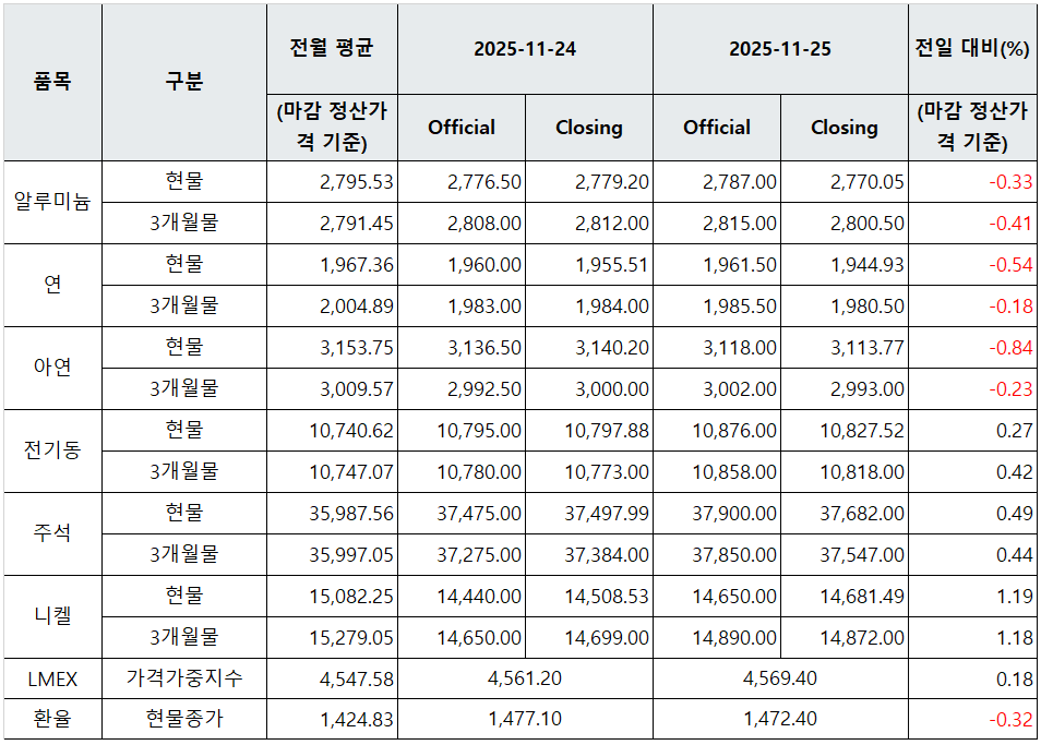 [표] LME 비철금속 및 환율 동향(11월 25일)