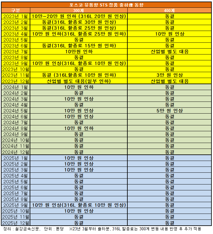 포스코는 12월 유통향 STS 출하 가격을 300계와 400계 모두 동결한다고 시장에 통보했다. 300계 기준으로는 2개월 연속 동결이고 400계 기준으로는 19개월 연속 동결됐다.