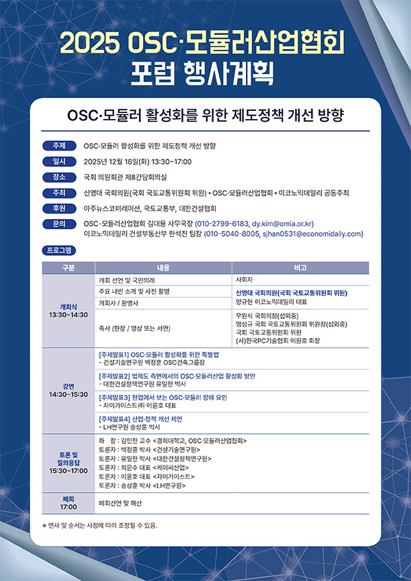 OSC·모듈러산업협회(회장 김인한)가 오는 16일 오후 1시30분 국회 의원회관 제8간담회의실에서 ‘OSC·모듈러 활성화를 위한 제도정책 개선 방향’을 주제로 포럼을 개최한다.