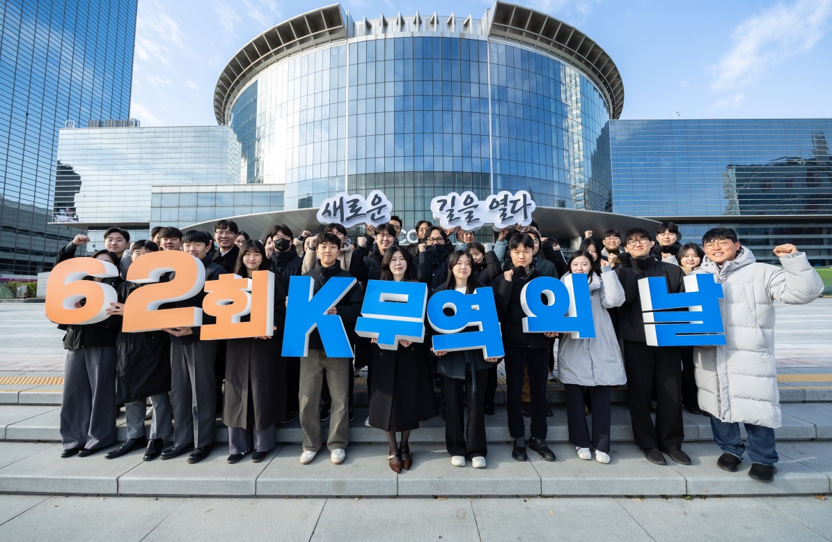 제62회 '무역의 날' 기념식을 앞두고 서울 강남구 코엑스 광장에서 한국무역협회 직원들이 올해 슬로건인 "K-무역, 새로운 길을 열다"를 들고 기념촬영을 하고 있다.