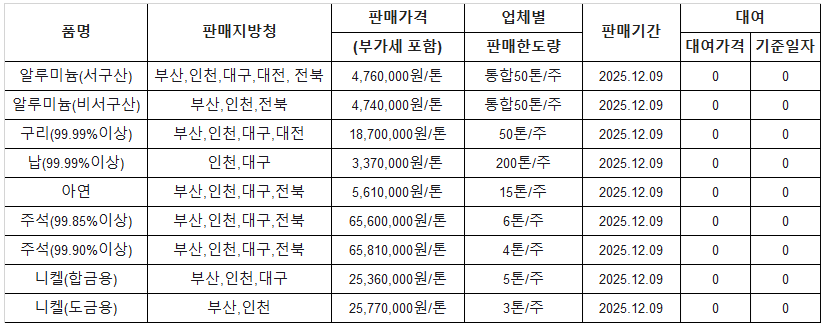 [표] 조달청 방출 가격(12월 9일)