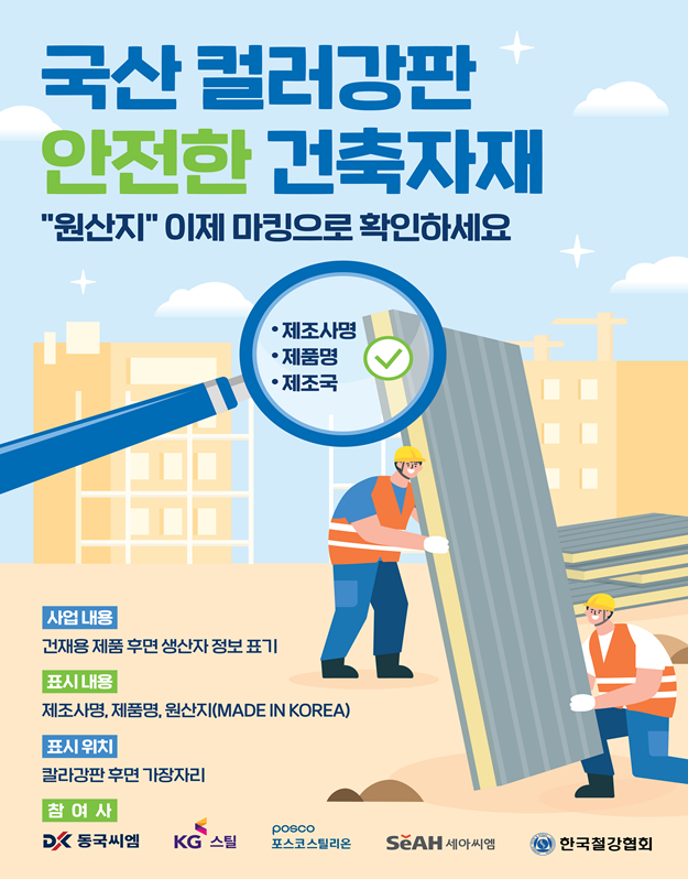 국내 컬러강판 주요 제조사들이 건축용 컬러강판 후면에 제조사, 제품명, 원산지(MADE IN KOREA)를 직접 표기하는 자율 표기제를 도입하며 건자재 관리 투명성 강화에 나선다.