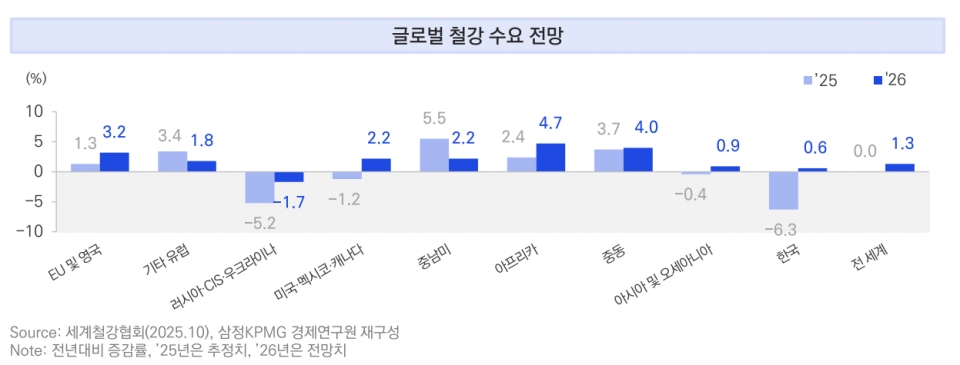 다만 국내 수요는 상대적으로 증가세가 둔화될 것으로 내다봤다. 삼정KPMG는 “2026년 국내 철강 수요는 2025년 대비 증가할 전망이지만 전 세계 성장률의 절반 수준인 0.6%에 그칠 것”이라며 “일본과 중국의 저가 제품 공급 지속, 미국 수출 제품에 대한 50% 고율관세 부과, 국내 건설 경기 침체 장기화로 인해 국내 철강 수요 회복세는 더딜 전망으로, 정부는 K-스틸을 통해 국내 철강산업 경쟁력 강화 및 탄소중립 전환 지원 방침”이라고 설명했다.