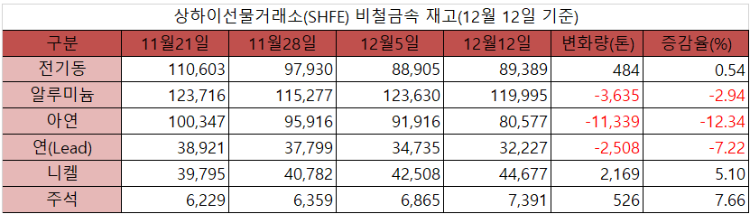 [표] 상하이선물거래소 재고(12월 12일)