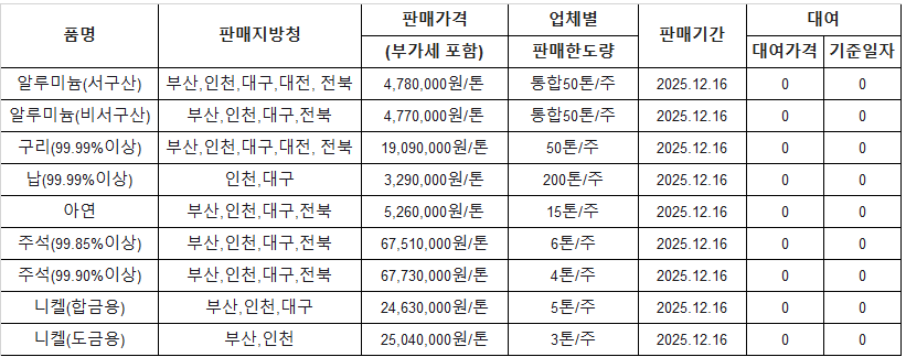 [표] 조달청 방출 가격(12월 16일)