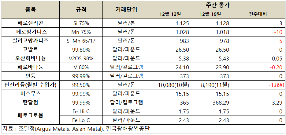 [표] 희유금속 가격 동향(12월 19일)