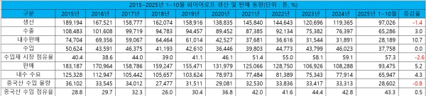 한국철강협회 데이터에 따르면 2025년 1~10월 와이어로프 생산은 9만7,026톤으로 전년 대비 1.4% 감소한 반면, 판매는 9만3,475톤으로 전년 대비 5.2% 증가했다. 내수판매와 수출은 각 2만8,189톤, 6만5,286톤으로 전년 대비 10.7%, 3.0% 증가했고, 국내 수요는 6만5,947톤으로 전년 대비 4.3% 증가했다. 총 수입 물량과 중국산 수입 물량은 각 전년 대비 보합, 0.8% 감소했고, 수입 점유율은 전년 대비 2.6%P 하락한 반면, 중국산 점유율은 전년 대비 0.5%P 상승했다.