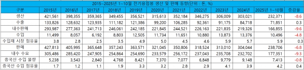 선재업계는 물론 철강업계 전체에서도 수입재 영향이 가장 적은 용접재료의 경우에도 수요 부진 여파를 비켜가지는 못했다. 2025년 1~10월 전기용접봉 생산 및 판매는 각 23만2,371톤, 23만8,706톤으로 전년 대비 8.6%, 6.8% 감소했다. 내수판매와 수요는 16만6,855톤, 17만7,351톤으로 전년 대비 9.6%, 9.3% 감소한 반면 수출은 7만1,851톤으로 전년 대비 0.3% 증가했다. 총 수입 물량과 중국산 수입 물량은 1만496톤, 7,413톤으로 점유율이 5.9%, 4.2% 수준에 불과했다.