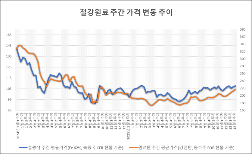 키워드 #철광석 #원료탄 이사무엘 기자 smlee@snmnews.com 다른 기사 보기 관련기사 “중소기업 성장사다리 복원과 AI·글로벌 경쟁력 강화에 정책 역량 집중” 日·中 열연강판 잠정관세 6월까지…본조사 장기화 신호 밀워키, 12V 콤팩트 임팩트 렌치 ‘M12 FSCIWF38’ 소개 (특수강봉강) 반덤핑 조사 연기에 수입재 잠식 심화 12월 다섯째 주, 국내 철스크랩價 보합 (선재) 中 저가 공세에 신선·가공업계 생산 위축 [이슈] 반짝이는 고깃집 덕트의 이면…생활자재 곳곳에 스며든 중국산 저가 철강재와 6가 크로뮴 중국 조선 ‘고점 유지’…후판 가격은 증설 변수 [후판] 수요 공백 장기화…연말 관망 흐름 한중 통상장관회의 개최…FTA 서비스·투자 후속협상 가속화 논의 2026년 철강, 수출 감소 불가피…관세·CBAM·경기 둔화 ‘삼중 압박’ 건설기계 수급조절 연장…고장력·내마모강 수요 영향은? "철강도 예외 없다"…제3국 ‘단순 가공’도 우회덤핑 판단 대상 저작권자 © 철강금속신문 무단전재 및 재배포 금지