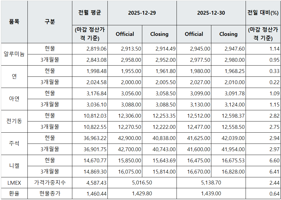 [표] LME 비철금속 및 환율 동향(12월 30일)