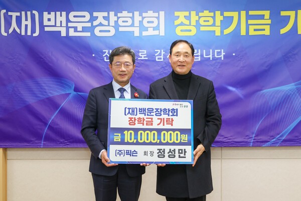 파형강관 제조업체 픽슨의 재단법인 백운장학회(이사장 정인화)는 시청 만남실에서 정성만 픽슨 회장을 비롯한 임직원이 참석한 가운데 장학금 기탁식을 개최했다.