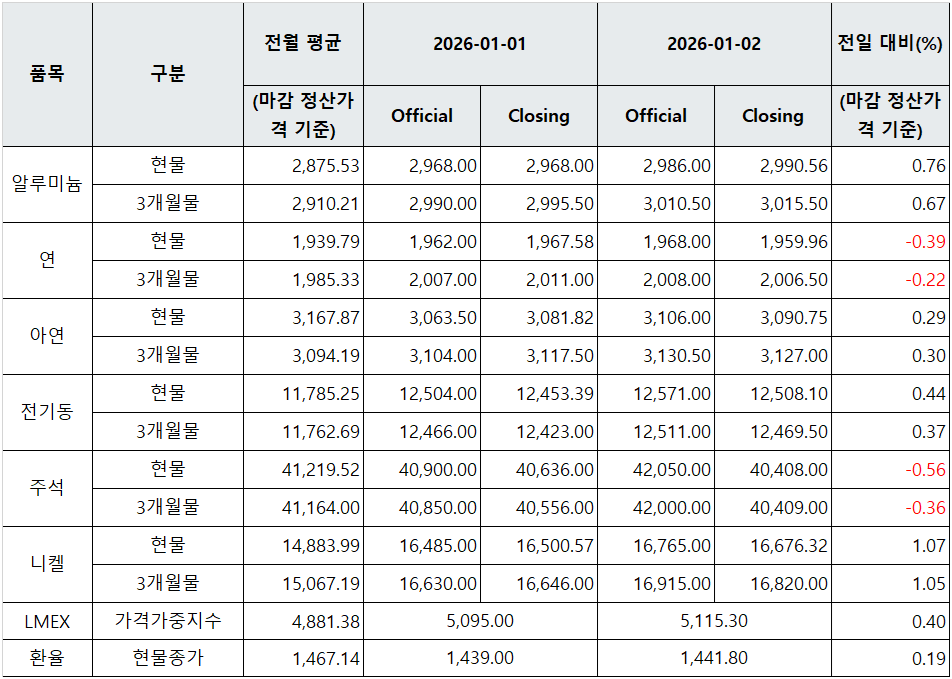 [표] LME 비철금속 및 환율 동향(1월 2일)