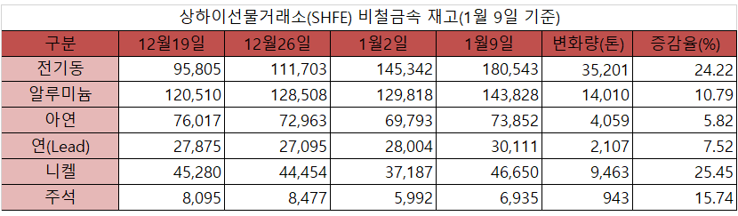 [표] 상하이선물거래소 재고(1월 9일)