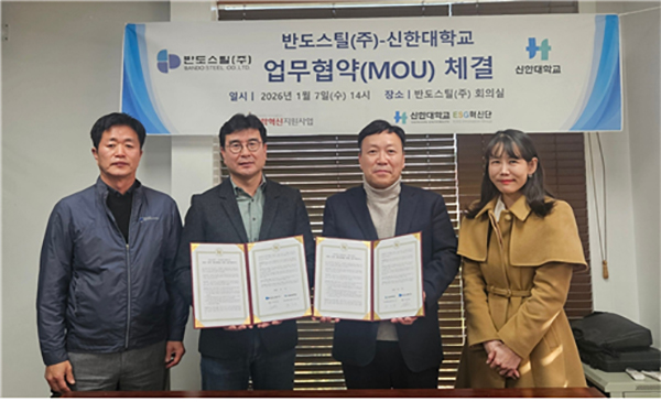 이번 협약식에는 반도스틸 한영섭 회장과 김현기 대표이사를 비롯한 임원진, 신한대학교 권오근 ESG혁신단장과 이나경 혁신팀장 등 양 기관 관계자들이 참석해 산학협력의 의미를 공유했다.