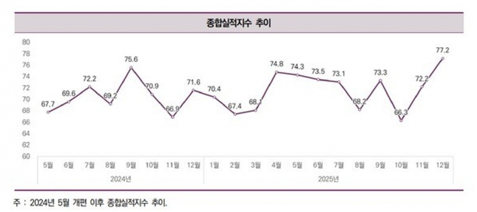 지난해 10월(66.3)을 저점으로 두 달 연속 급등세다. 또한 재작년 5월 지수 개편 이래 최고치다.