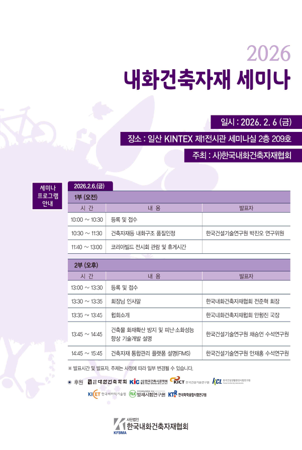 사단법인 한국내화건축자재협회는 오는 2월 6일 일산 킨텍스에서 ‘2026 내화건축자재 세미나’를 개최한다.