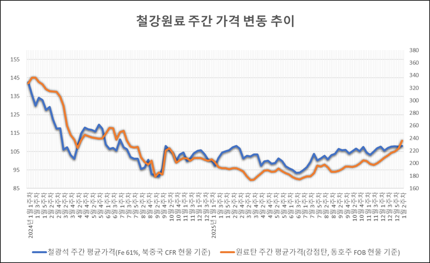 키워드 #철광석 #제철용 원료탄 이사무엘 기자 smlee@snmnews.com 다른 기사 보기 관련기사 KBI동양철관, 임직원 급여 끝전 모아 불우이웃돕기 성금 기탁 현대비앤지스틸, 2025년 매출 7,412億-영업익 258億 달성 노동부, 현대제철에 불법파견 노동자 직접고용 시정지시 고용노동부, 철강·석유화학 밀집 5개 지역 고용위기 선제 대응 (특수강봉강) AD 조사 연기에 수입재 잠식·제품價 약세 지속 (선재) 수요 부진·수입 증가 지속 日 도쿄제철, 2월 全제품값 유지…새해 두 달 연속 동결 현대제철, 포항 봉강공장 철근 생산 '단일화'…특수강 당진 이관 [후판] 연초 시장, ‘가격 신호’ 시험대 [열연강판] 가격 상향 정조준…연초 시장 ‘상승 흐름’ HD한국조선해양, 유조선·PC선 4척 수주…4,816억 원 규모 저작권자 © 철강금속신문 무단전재 및 재배포 금지
