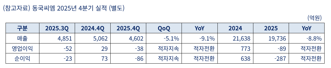 동국씨엠은 지난 23일 공시를 통해 별도 기준 2025년 4분기 매출 4,602억 원, 영업손실 38억 원, 순손실 86억 원을 기록했다고 밝혔다. 매출은 전기 대비 5.1% 감소했고, 수익성 지표는 적자가 지속됐다.
