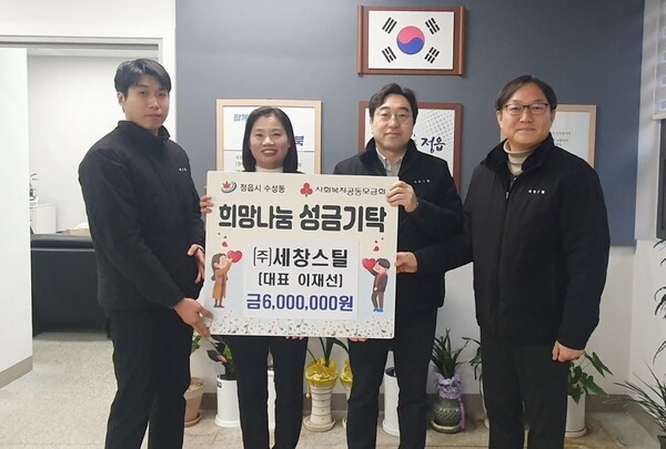 정읍시 제2산업단지 소재 세창스틸(대표 이재선)이 지난 22일 수성동주민센터(동장 김수홍)에 희망나눔성금 600만원을 기탁했다.