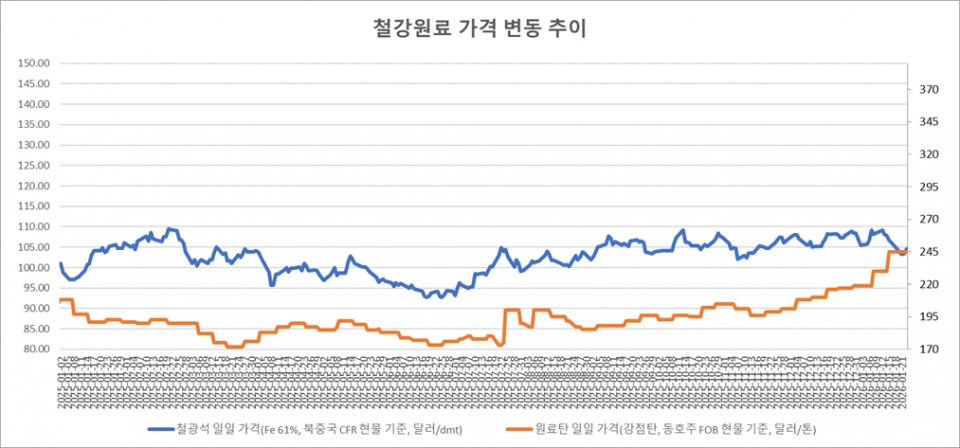 키워드 #철광석 #제철용 원료탄 이사무엘 기자 smlee@snmnews.com 다른 기사 보기 관련기사 동국씨엠, 매출 부진 및 수익 악화에 적자 전환 중기중앙회, ‘2026년 공동사업개발 전문컨설팅 지원사업’ 신청 공고 수요 감소에도 신흥국 저가 공세에 2025년 합금철 수입 역대 ‘최대’ 지난해 日 소봉 생산 641만톤 전년比 5.8%↓ 시황 악화에 HBI 등 직접환원철 수요 '뚝' 세창스틸, 수성동주민센터에 희망나눔성금 600만원 기탁 [연재] 산업현장 안전에 미래 달렸다 - 리코일러 설비 내 코일 이동 중 끼임 베스타스, 국내에서 31MW급 풍력발전프로젝트 신규 수주 기후대응에서도 ‘국내 유일’…현대제철, CDP 리더십 등급 포스코 열연價 인상…철강업계 원가·수익 구조 정상화 시동 [주간원료동향] ‘中 항구 재고 최대’ 철광석 價↓ 저작권자 © 철강금속신문 무단전재 및 재배포 금지