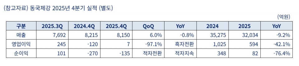 동국제강이 26일 2025년도 4분기 잠정 실적을 공시했다.