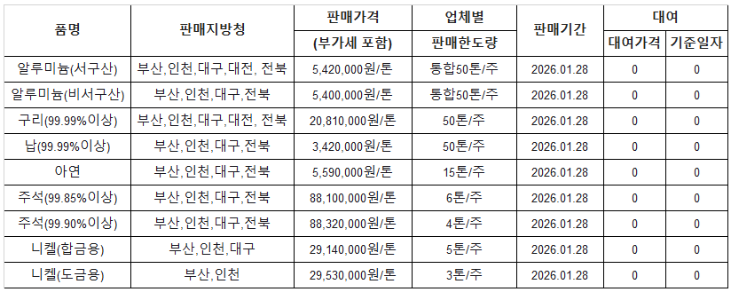 [표] 조달청 방출 가격(1월 28일)