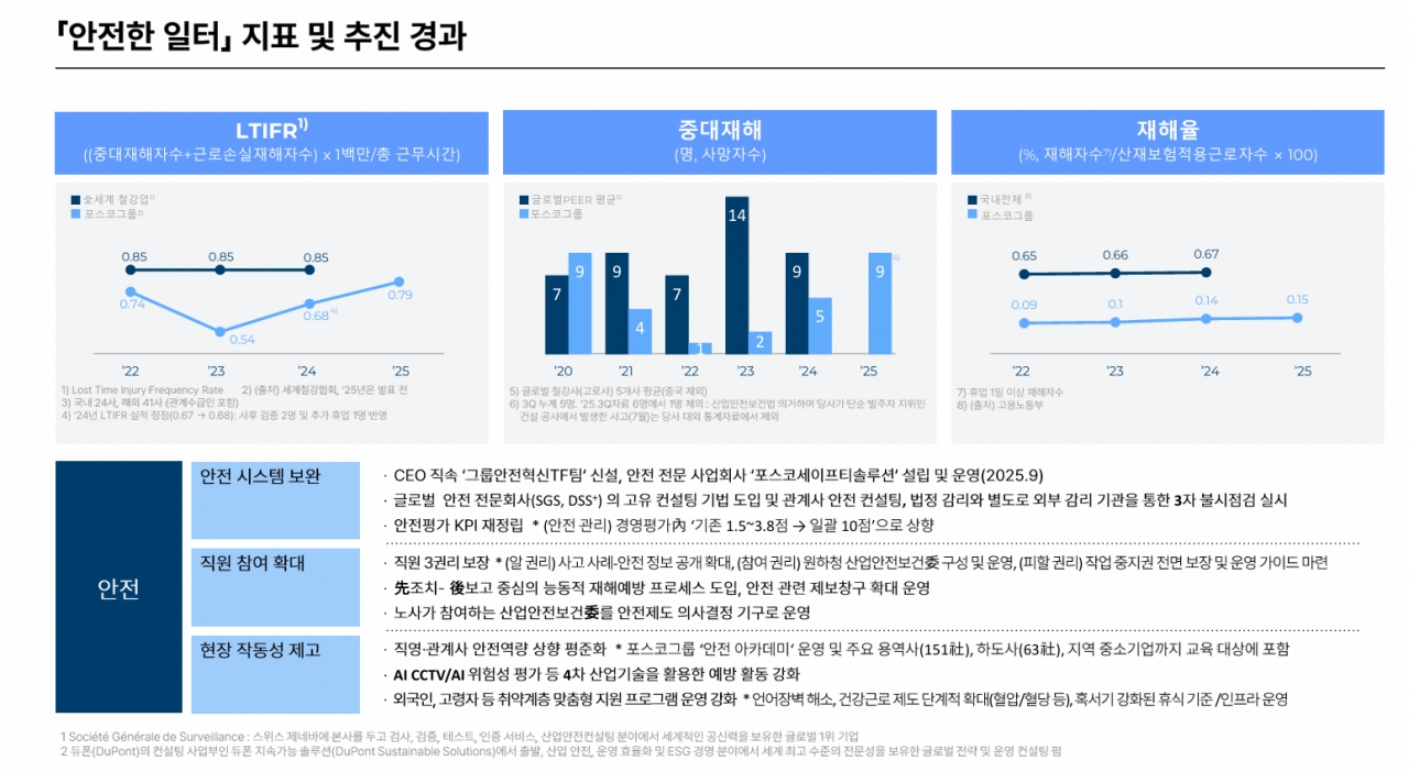 회사는 안전교육과 안전지원의 범위도 협력사를 넘어 지역 생태계 단위로 확대했다. 포스코그룹은 자체 ‘안전 아카데미’를 통해 151개 용역사와 63개 하도사, 지역 중소기업까지 안전 교육을 제공하며 상생 안전을 실천하고 있다. 여기에 더해 외국인 근로자를 위한 다국어 안전 수칙 제공과 고령 근로자의 건강 진단 강화 등 취약계층을 위한 케어 프로그램도 단계적으로 강화하여 빈틈없는 일터 조성에 나설 것을 선언했다.