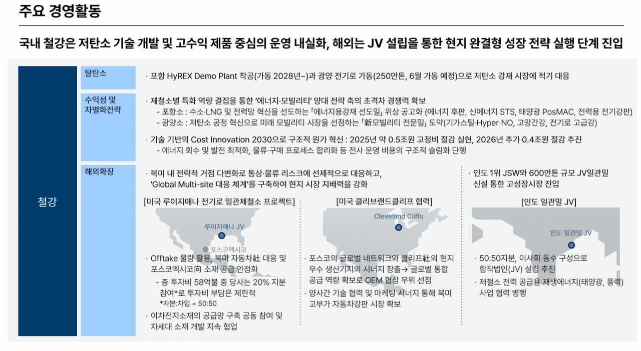 국내 부분은 포항제철소에서는 수소와 LNG 기반의 에너지용강재 선도밀로서 수소 후판, 신에너지용 STS 등을 통해 위상을 공고히 하고 있으며, 광양제철소는 기가스틸과 전기차용 무방향성 전기강판(Hyper NO) 등 미래 모빌리티 시장을 선점하는 전문 제철소로 도약하고 있다. 특히 포항 HyREX 데모 플랜트 착공과 광양 전기로(250만 톤)의 오는 6월 가동을 통해 저탄소 강재 시장에 적기 대응할 계획이다. 또한 전사적인 ‘Cost Innovation 2030’을 통해 작년 0.5조 원에 이어 올해 0.4조 원의 구조적 원가 절감을 추가로 추진한다.
