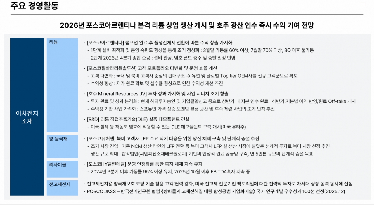 그룹은 2026년을 아르헨티나 리튬 상업 생산 본격 개시와 호주 광산 인수를 통한 수익 창출 가시화의 해로 정하고 이차전지소재 풀밸류체인 가동에 박차를 가할 예정이다. 특히 포스코아르헨티나의 1단계 설비는 3월 가동률 60%를 거쳐 3분기 이후 풀가동 체제로 전환되며, 2단계 설비 또한 올해 4분기 종합 준공을 목표로 순항 중이다.