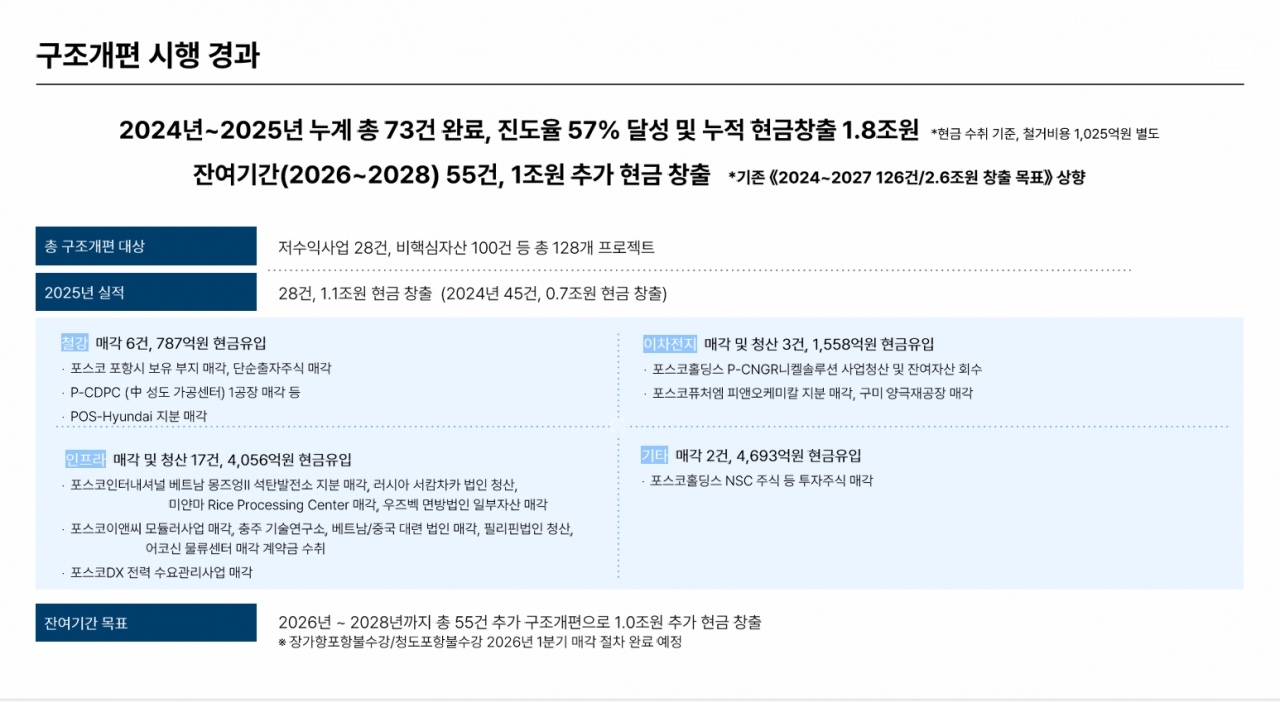 포스코그룹은 2024년부터 2025년까지 총 73건의 구조개편을 완료하며 진도율 57%를 달성했다. 이를 통해 누적 1.8조 원의 현금을 창출하는 성과를 거뒀다.