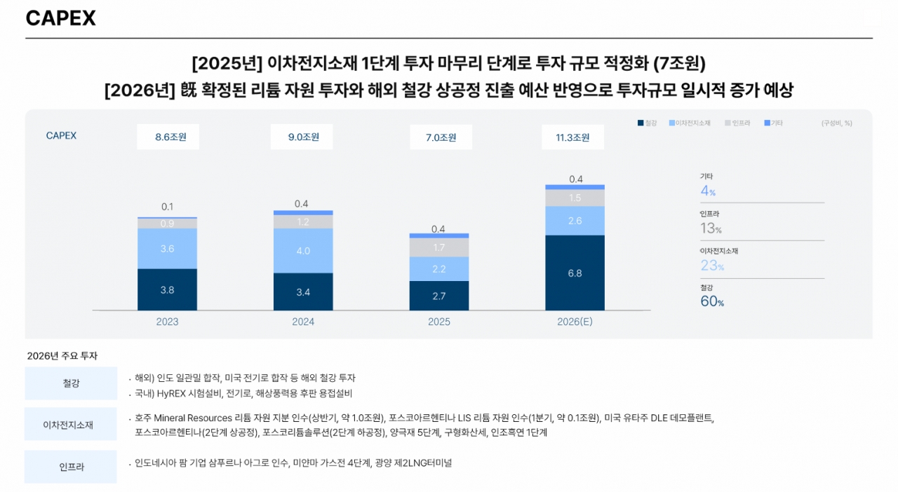 이와 관련해 포스코홀딩시는 2026년 연결 기준 자본적 지출(CAPEX) 규모를 11.3조 원으로 책정했다. 이는 2025년(7조 원) 대비 약 61% 급증한 수치로, 일시적인 투자 집중을 통해 시장 지배력을 공고히 하겠다는 의지로 풀이된다.