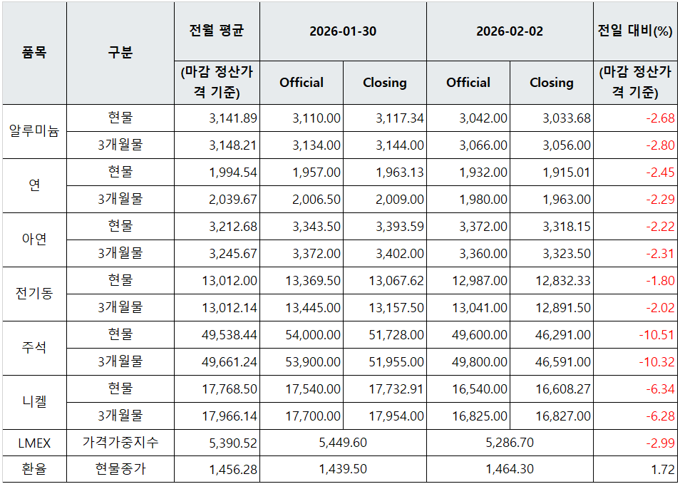 [표] LME 비철금속 및 환율 동향(2월 2일)