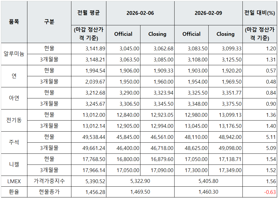 [표] LME 비철금속 및 환율 동향(2월 9일)