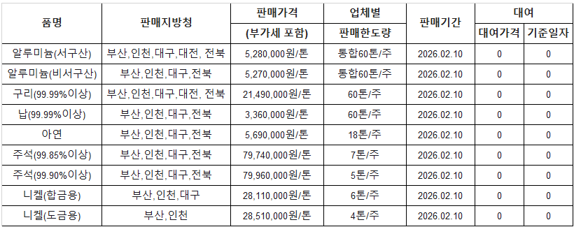 [표] 조달청 방출 가격(2월 10일)