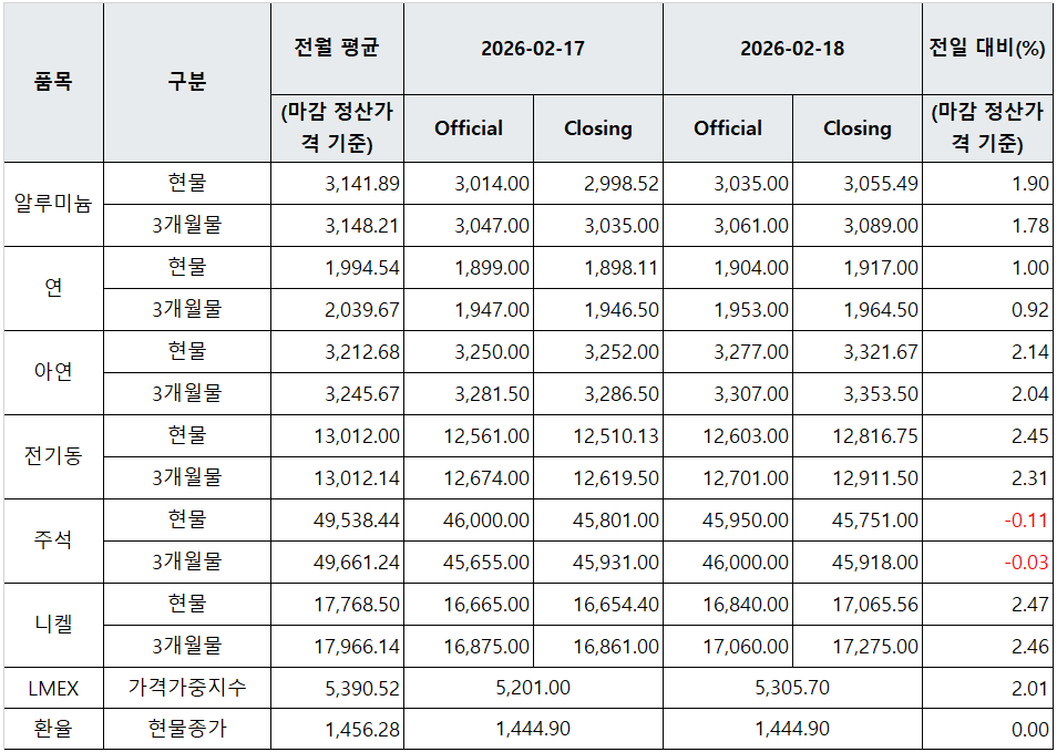 [표] LME 비철금속 및 환율 동향(2월 18일)