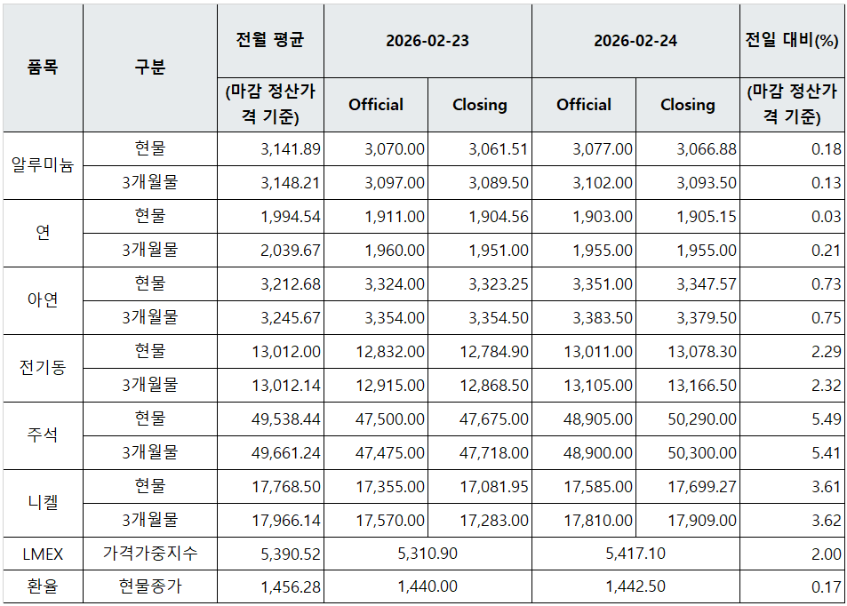 관련기사 [표] LME 비철금속 및 환율 동향(2월 23일) [일일비철시황] 美 상호관세 위법 판결에 LME 상승…달러 약세에 비철 강세 [표] LME 비철금속 및 환율 동향(2월 20일) [일일비철시황] 매파적 FOMC 의사록·달러 강세·중동 긴장 겹쳐 LME 비철 약세