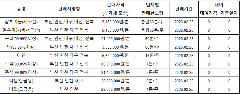 [표] 조달청 방출 가격(2월 25일)