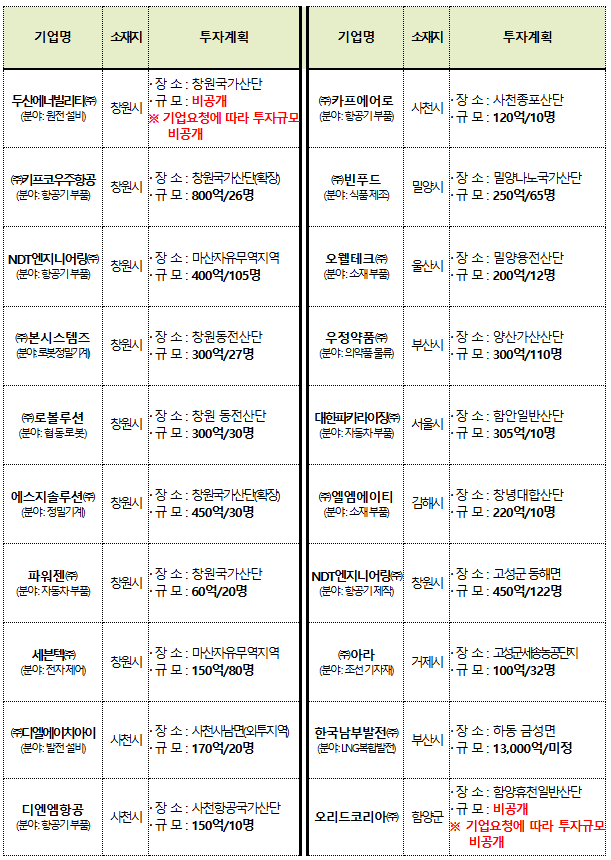 창원시에는 두산에너빌리티 등 원자력 및 방산·로봇 분야 8개 기업이 약 4,000억 원을 투자해 생산라인을 구축한다. 사천시에는 디엘에이치아이(DL HI) 등 항공기 부품 및 발전 설비 관련 3개 기업이 440억 원 규모의 투자를 확정해 우주항공 산업 생태계를 견고히 한다.