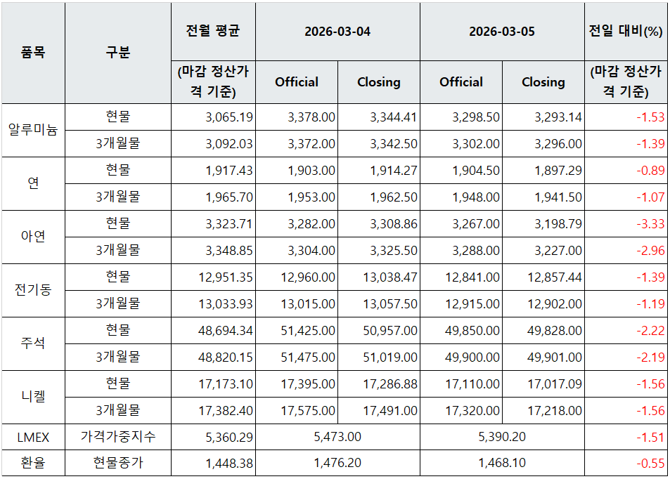 김영은 기자 yekim@snmnews.com 다른 기사 보기 관련기사 [표] LME 비철금속 및 환율 동향(3월 4일) [표] LME 비철금속 및 환율 동향(3월 3일) [표] LME 비철금속 및 환율 동향(3월 6일) 3월 9일 원/달러 환율 1,495.50원...엔화·유로·위안화 [표] LME 비철금속 및 환율 동향(3월 9일) 저작권자 © 철강금속신문 무단전재 및 재배포 금지